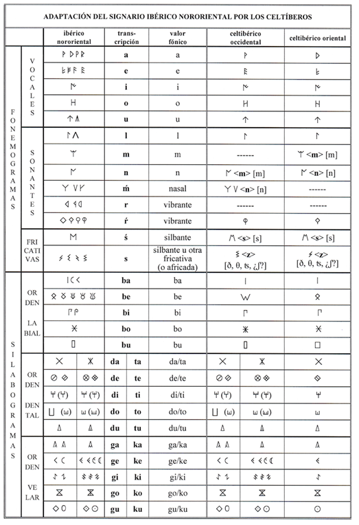 Las inscripciones celtibéricas más antiguas fueron escritas utilizando con mínimas modificaciones el sistema de escritura ibérico propio de las regiones costeras mediterráneas, caracterizado por el uso de signos correspondientes a un solo fonema (a, e, i, o, u, l, m, n, r, s, z) y otros silábicos que representan la serie oclusiva (ba, be, bi, bo, bu; ka, ke, ki, ko, ku; ta, te, ti, to, tu) (Beltrán y Jordán 2016; Jordán 2019) (Figura 2). Se han individualizado dos variantes principales, denominadas occidental y oriental en función de su dispersión geográfica, que difieren sobre todo en los signos empleados para las nasales. Además se ha señalado en algunas inscripciones el empleo de signos modificados con un trazo adicional para expresar el carácter sonoro o sordo de la consonante (ka / ga, ta / da, …), una variedad que se ha dado en denominar ‘sistema dual’ (Jordán 2005, 2019). Esta combinación de signos silábicos y alfabéticos caracteriza a los diversos sistemas de escritura llamados paleohispánicos (Ferrer y Moncunill 2019) que fueron utilizados en el sur y el este de Hispania entre los siglos VIII/VII y I a. E. por pueblos meridionales de lengua indeterminada, por las comunidades ibéricas de la costa mediterránea —que manejaron dos variantes bien diferenciadas además de una adaptación del alfabeto griego— y por gentes del noroeste del valle medio del Ebro (Beltrán y Velaza 2009), incluidas los hablantes del idioma vascónico, precedente del vasco actual, una de las poquísimas lenguas prerromanas que ha sobrevivido hasta la actualidad en Europa y de la que podría haberse hallado el primer texto, si en efecto se confirma que ese es el idioma de la inscripción grabada sobre la ‘Mano de Irulegui’ (Aiestarán, Gorrochategui y Velaza 2023).
