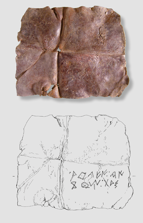 Como ya se ha dicho, la fórmula podía abreviarse y reducirse al nombre personal o a este y el nombre familiar. Así, en la carta sobre lámina de plomo conquense a la que se ha hecho referencia más arriba [CU.00.01], en la cara exterior de la lámina, doblada en cuatro pliegues con la finalidad de dejar el texto en el interior y el nombre del destinatario en el exterior, aparece a modo de dirección: abulei kaikokum tatuz. Hay acuerdo en entender las dos primeras palabras como una fórmula onomástica con el nombre personal en dativo y la última como una forma imperativa del verbo ‘dar’, una interpretación que refuerza su posición exterior en la lámina de plomo: “Dése a Abulo de los Caicocos” (Figuras 3 y 4).