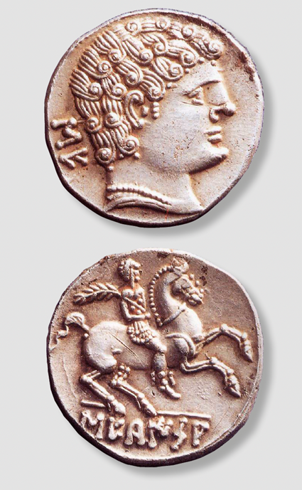 En cualquier caso, el uso de la escritura no se documenta en la Celtiberia con una cierta frecuencia hasta bien entrado el siglo II a. E. A lo largo de la primera mitad de esta centuria se sitúa la actividad de una serie de cecas que emiten moneda con leyendas que exhiben el nombre de la ciudad y una iconografía bastante monótona inspirada en las monedas de sus vecinos iberos: una cabeza, generalmente barbada, en el anverso y un jinete, casi siempre enarbolando una lanza, en el reverso. Una de las particularidades de estas cecas es que suelen repetir el signo inicial del nombre de la ciudad en la otra cara de la moneda (bilbiliz / bi [Mon.73]). Entre las emisiones más tempranas se cuentan las de la ya mencionada ciudad de sekeiza [Mon. 78], a las que a lo largo de los siglos II y I a. E. se fueron sumando otras muchas: turiazu, belikiom, kalakorikos, sekisamos, sekobirikez, arekorata, erkauika, konterbia karbika,… (Jordán 2019). Habida cuenta de que las primeras intervenciones romanas en la Celtiberia datan de comienzos de este siglo debe concluirse que las acuñaciones celtibéricas se desarrollaron en contacto con Roma o directamente bajo su control. Las leyendas muestran claramente que estas monedas son acuñaciones cívicas que exhiben el nombre de la comunidad bajo cuya autoridad se emiten. Se trata, en consecuencia, de epígrafes de carácter oficial y público además (Figura 5).