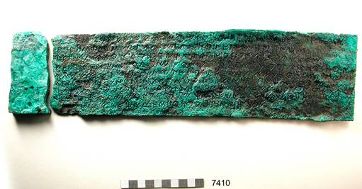 Los tres bronces celtibéricos antes mencionados, dos íntegros, Botorrita 1 y 3, y otro parcialmente conservado, Botorrita 4, conforman el mayor conjunto escrito de la Céltica antigua, como ya se ha dicho. Desafortunadamente, el contenido de estos documentos no resulta fácil de desentrañar, aunque hay acuerdo en considerar que son disposiciones emanadas de las autoridades cívicas de la ciudad. Botorrita 1 —con el que presenta claras concomitancias Botorrita 4— es un texto opistógrafo, es decir escrito por las dos caras, en una de las cuales aparece un listado de individuos con fórmulas onomásticas completas. Se ha especulado con la posibilidad de que se trate de una disposición vinculada con las tierras de un santuario, aunque se trata de una hipótesis incierta [Z.09.01] (Figuras 15 y 16). Botorrita 3 contiene un largo texto dotado de una especie de título y de 220 líneas dispuestas en cuatro columnas —un tipo de maquetación de sabor claramente romano— en las que se registra un largo listado de hombres, mujeres y niños con un propósito aún por esclarecer (Figuras 17 y 18).