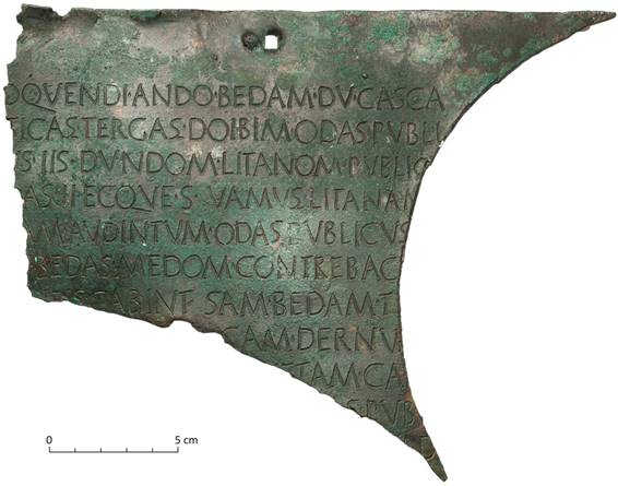 Hasta hace pocos años la única ciudad en la que estas placas con largas inscripciones estaban atestiguadas era Contrebia Belaisca (Botorrita), de donde proceden, además de otros textos menores sobre láminas de bronce, tres placas de notable tamaño conocidas como Botorrita 1, Botorrita 3 y Botorrita 4. A cambio Botorrita 2, la ‘Tabula Contrebiensis’ varias veces mencionada ya (CIL I,2 2951a), es una placa de bronce también, pero redactada en latín para poner por escrito y exhibir la sanción que en 87 a. E. el gobernador romano Marco Valerio Flaco dio a la sentencia emitida por el senado de Contrebia para dirimir un pleito por la construcción de un canal —seguramente de riego y probablemente identificable con la acequia de La Almozara— entre las ciudades vecinas de Salduie (Zaragoza), ibérica, y Alauo (Alagón), vascónica, con mención explícita de un praetor y varios magistratus de la ciudad. Esta inscripción latina, por una parte, pone de manifiesto, desde una perspectiva diferente a las téseras de hospitalidad y a las acuñaciones monetales, la vitalidad política e institucional de las ciudades-estado celtibéricas y, por otra, induce a pensar, dado que documenta la presencia en la ciudad del gobernador de la Hispania Citerior, que Contrebia Belaisca fue elegida por él para servir de sede a los encuentros periódicos con delegados de las comunidades del valle medio del Ebro durante sus giras por la provincia. La exhibición pública de esta disposición del gobernador y la presencia en la ‘acrópolis’ de la ciudad de un edificio monumental —seguramente un almacén de grano vinculado a las cargas impositivas de las ciudades indígenas— dotado de un pórtico de columnas toscanas sin paralelos en las ciudades del interior hispano refuerza la posibilidad de que Contrebia fuera visitada regularmente por Flaco para reunirse con los provinciales de la región, subrayando el papel creciente de la comarca como centro vertebrador del valle medio del Ebro que más adelante quedará sancionado con la fundación de la colonia Caesar Augusta (Zaragoza) y explica la exhibición de la Tabula Contrebiensis en la ciudad.